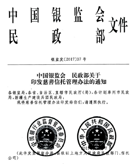 第六条 国务院银行业监督管理机构及其派出机构、国务院民政部门及县级以上地方各级人民政府民政部门根据各自法定职责对慈善信托实施监督管理。